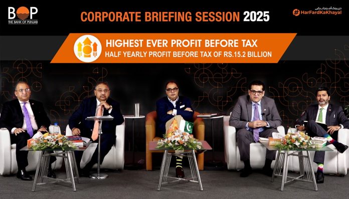 The Bank of Punjab (BOP) yesterday hosted a corporate briefing for brokerages, research analysts, and market participants to share its half-yearly and annual financial performance. The session was led by President & CEO Mr. Zafar Masud, joined by Mr. Nadeem Amir (Chief Financial Officer), Mr. Nofel Daud (Chief Digital Officer), Mr. Kamran Hafeez (Company Secretary), Mr. Qasim Nadeem (Group Head Treasury & Capital Markets), and Mr. Umer Khan (Group Head Corporate & Investment Banking).