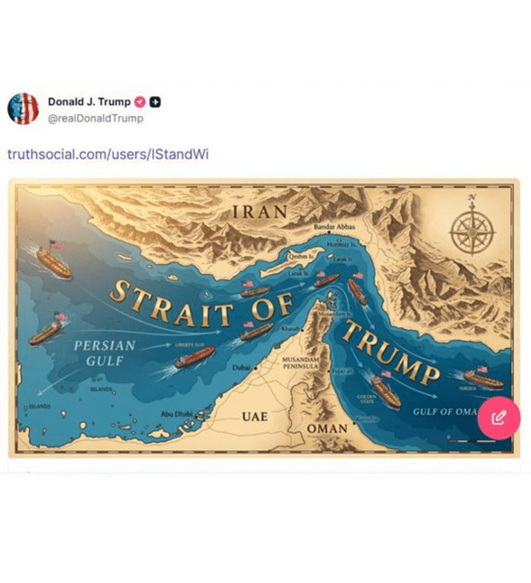 Donald Trump recently shared a map on his Truth Social account where he referred to the Strait of Hormuz as the “Strait of Trump.” The post quickly gained attention online, with many users reacting to the unusual renaming of one of the world’s most important shipping routes.