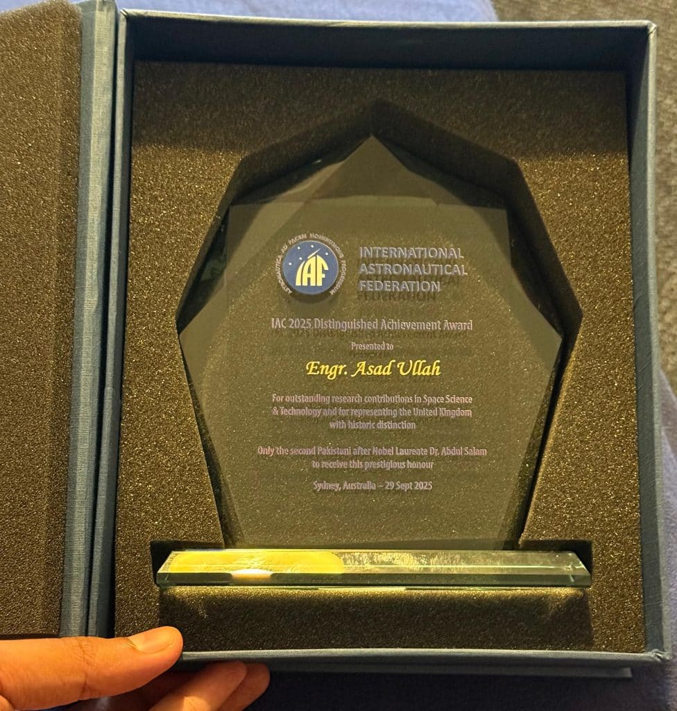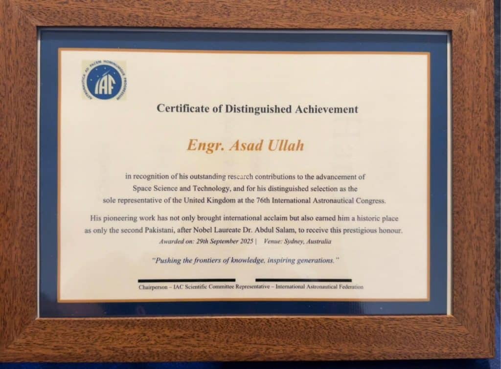 Asad’s pioneering research on Refractory High Entropy Alloys (RHEAs), which explores ultra-high-temperature materials for advanced aerospace propulsion systems, earned him international acclaim at the 76th International Astronautical Congress (IAC 2025) held in Sydney, Australia. At this prestigious global event, he was honoured with the Certificate of Distinguished Achievement by the International Astronautical Federation (IAF), becoming the sole representative of both the United Kingdom and Pakistan, and notably, the second Pakistani after Nobel Laureate Dr. Abdus Salam to receive such recognition for scientific excellence.
