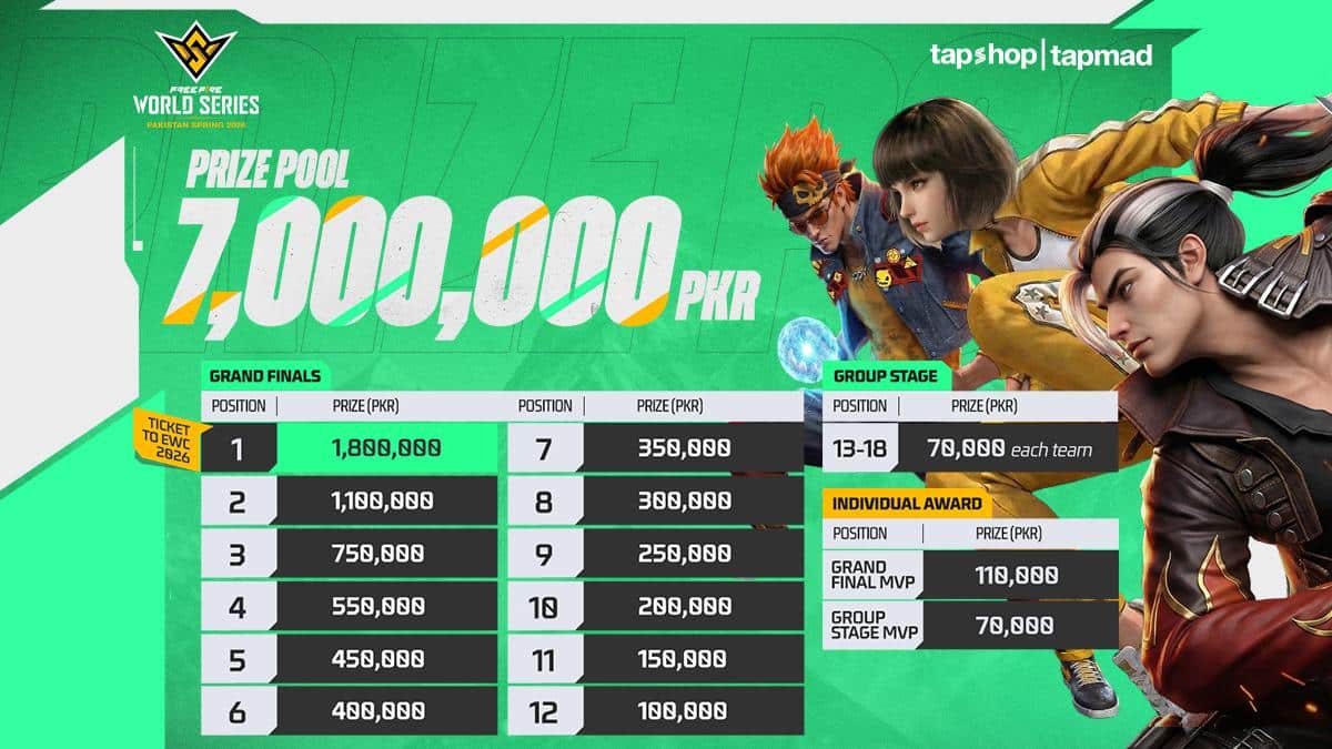Garena has announced the Free Fire World Series (FFWS) Pakistan Spring 2026, the official national tournament featuring a total prize pool of PKR 7,000,000 that will crown Pakistan’s representative for the Esports World Cup 2026. The tournament is sponsored by TapShop and Powered By Tapmad.