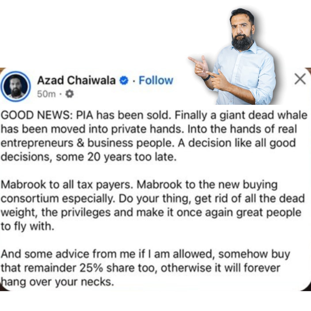 ‘Mabrook to All Tax Payers! Finally a Dead Whale into the Hands of Real Entrepreneurs & Business People’, Azad Chaiwala on PIA Privatization