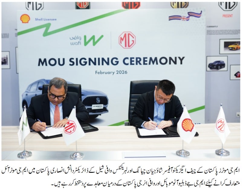 MG JW Automobile Pakistan Pvt. Ltd. has announced a landmark collaboration with Wafi Energy Pakistan Limited to launch MG Motor Oil in Pakistan. The signing ceremony was held at the MG CKD Plant in Lahore, attended by Mr. Shao, CEO MG Motors Pakistan, Mr. Danish Ansari, Director Lubricants Wafi Shell, and senior leadership from both companies.
